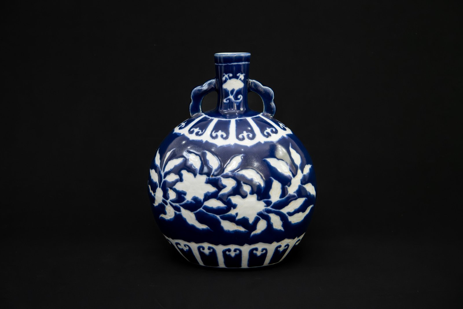Porcelain moon flask with deep cobalt-blue ground and white floral motifs in relief, inspired by the Ming Yongle period. The rounded body is surmounted by a slender neck with twin loop handles. A striking contrast of blue and white enhances its elegant form.