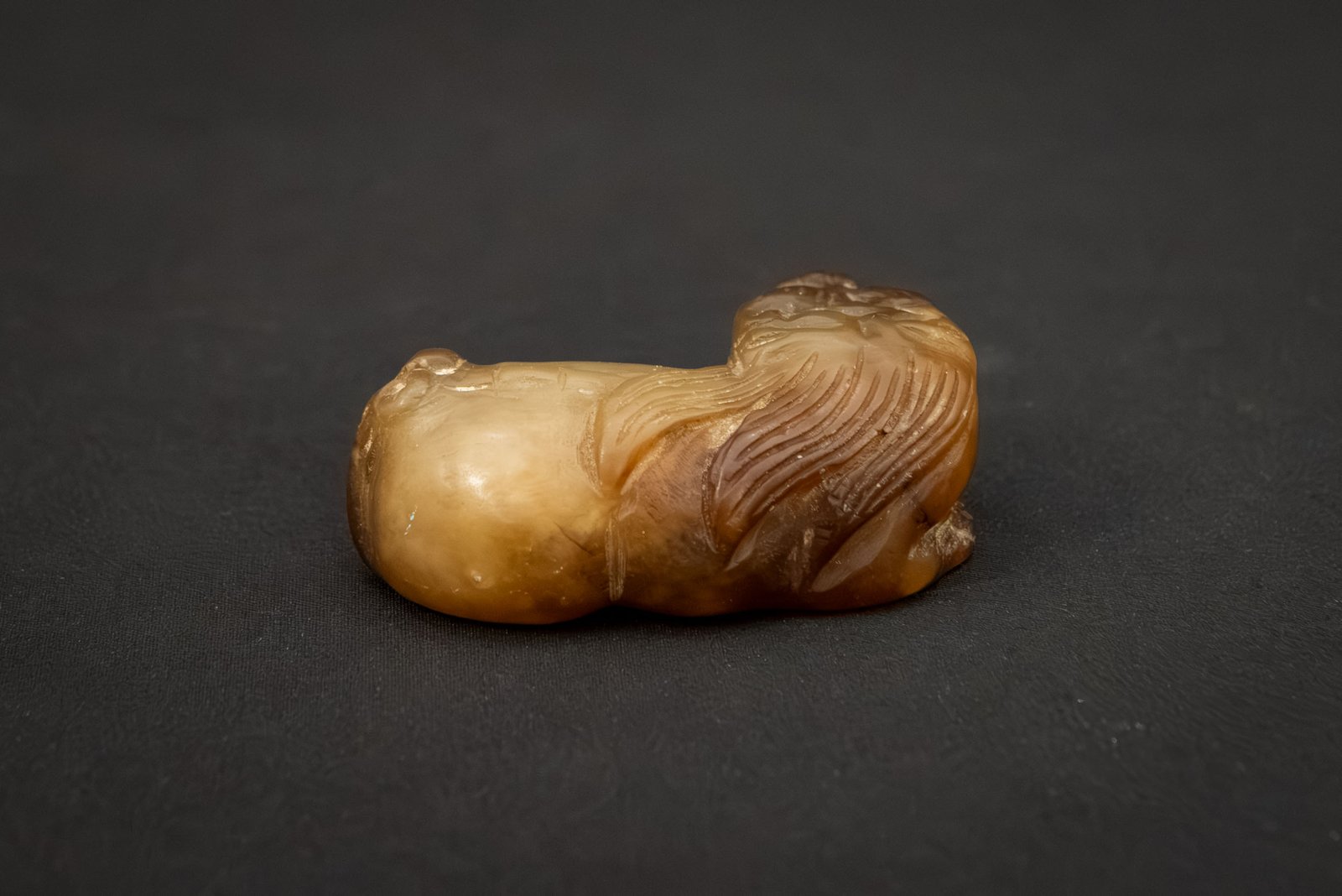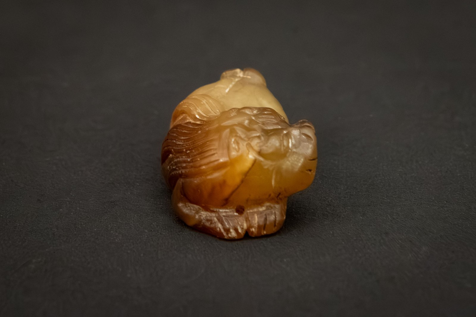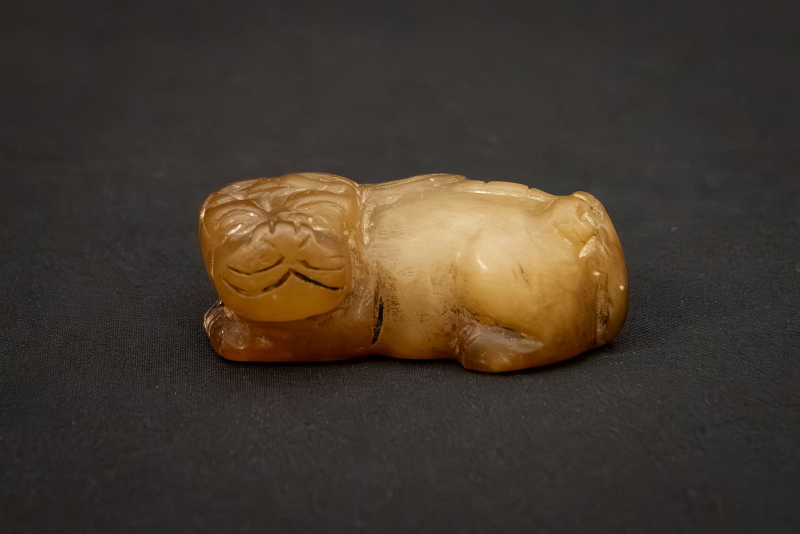 A finely carved jade figure of a reclining mythical beast, likely representing a lion. The creature is depicted in a recumbent pose with its head turned slightly upward, the features boldly incised to highlight the mane, eyes, and muzzle. The stone is of warm brownish-yellow tone with natural variations and inclusions. The form is compact yet expressive, conveying a sense of strength and watchfulness.