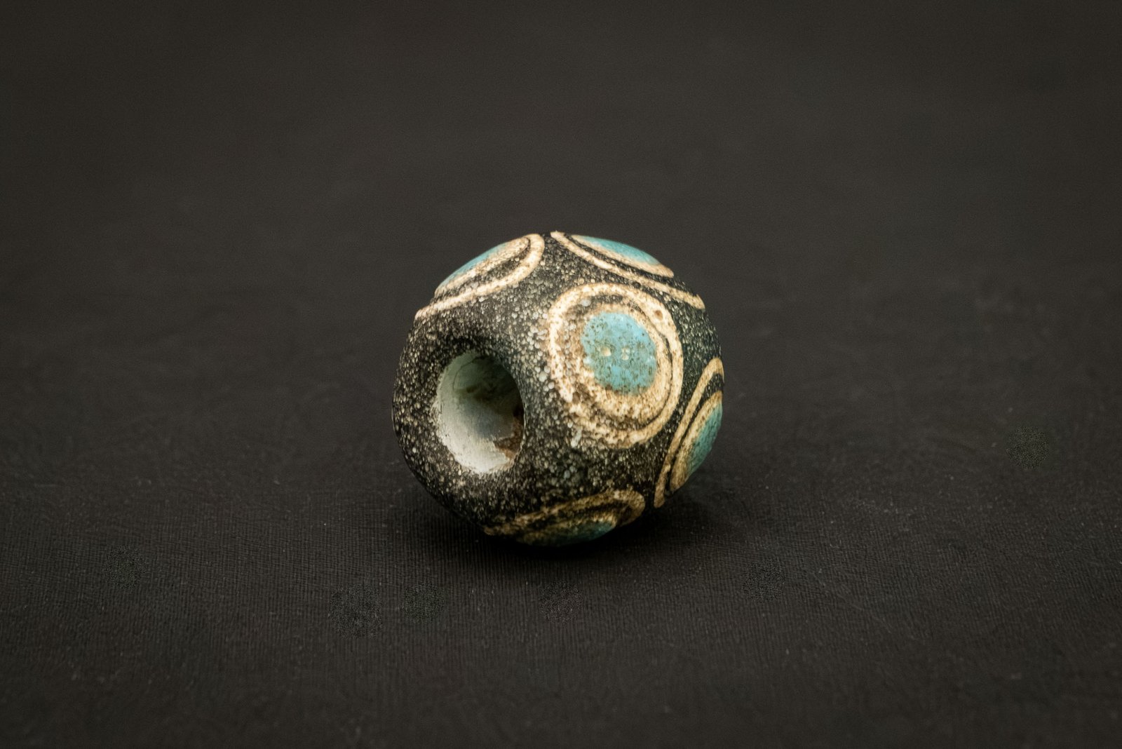 Glass bead decorated with concentric circular motifs, known as “dragonfly eyes.” Such beads were prized ornaments, believed to offer protection and reflecting both technical innovation and cross-cultural exchange in early Chinese glassmaking.